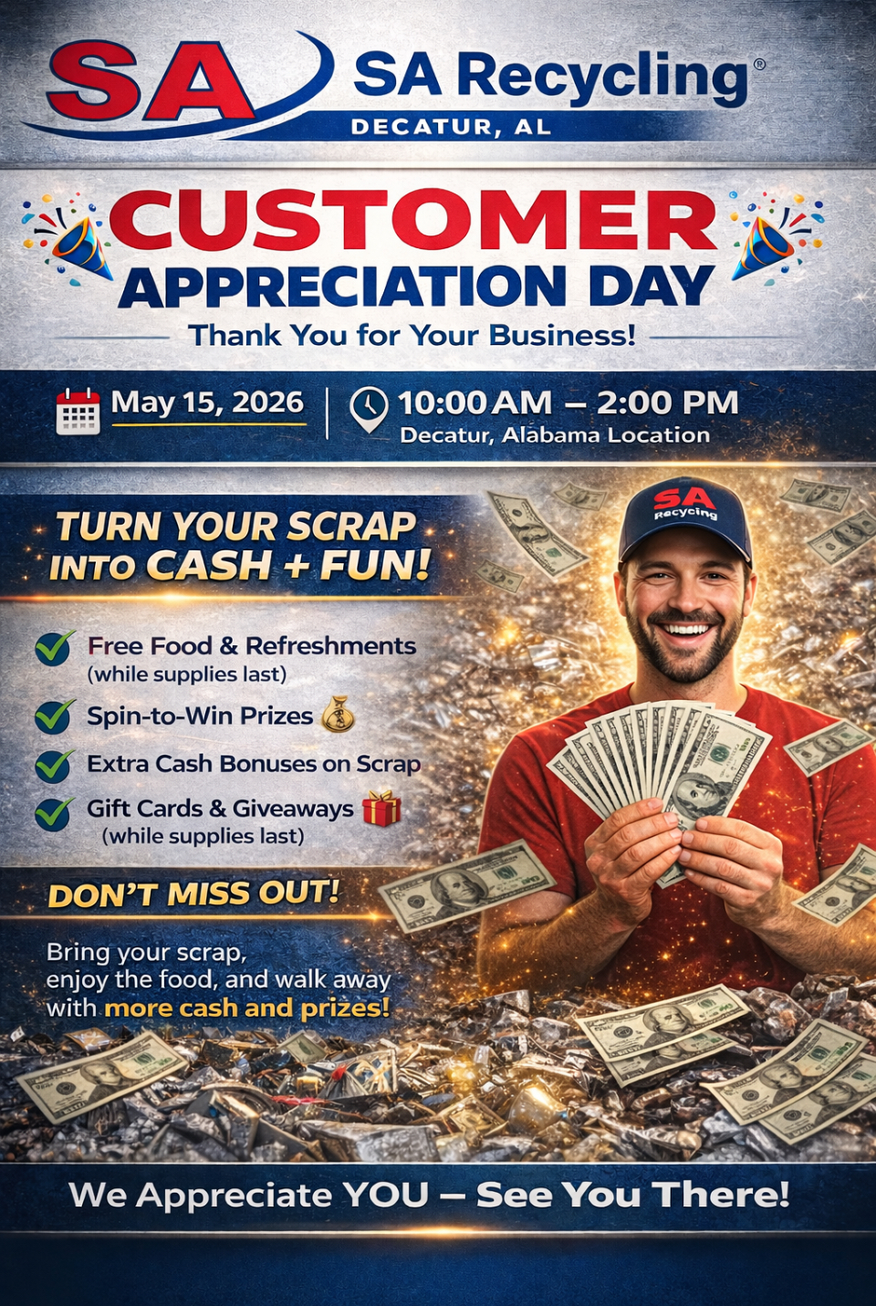 SA Recycling is your one stop shop recycling center. We pay top prices for cans and bottles, among other metals. Some of the metals we recycle include steel, aluminum, copper, tin, appliances, junk cars, cans, and many other types of scrap metal. For large commercial amounts of metal we provide roll off services. So whether you are an individual or a company, call us now for pricing on your scrap metal.